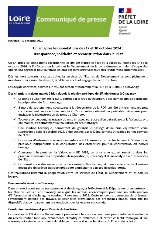 Un an après les inondations exceptionnelles qui ont frappé le Pilat et la vallée du Rhône les 17 et 18 octobre 2024, la Préfecture de la Loire et le Département de la Loire dressent un bilan d’étape des opérations engagées pour la remise en état des infrastructures routières lourdement endommagées.