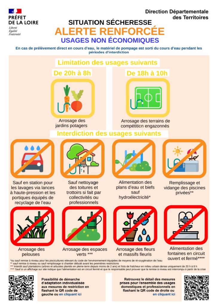 - Les informations de la Préfecture de la Loire sont à retrouver en cliquant ici : https://www.loire.gouv.fr/Actualites/Espace-presse/Communiques-2025/Aggravation-de-la-situation-de-secheresse2